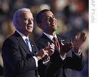 | Sen. Barack Obama, (r), and Democratic VP candidate, Sen. Joe Biden at the Democratic National Convention in Denver, 27 Aug 2008 |