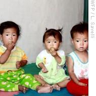 | Young children at a nursery in Myongchon County eating bread made with cereals from WFP, 29 Aug 2008 |