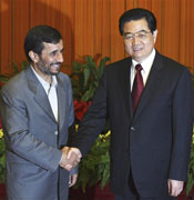 | Chinese President Hu Jintao (r) greets Iranian President Mahmoud Ahmadinejad at the Great Hall of the People in Beijing, 06 Sep 2008 |