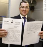 | Sergei Kupriyanov, Russia's state gas monopoly spokesman, shows a letter from Ukraine's state gas company Naftogaz, in Moscow, 31 Dec 2008 |