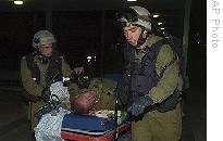 | Israeli soldiers evacuate5 a soldier, injured during an Israeli army operation in Gaza, into a hospital in Beer Sheva, southern Israel, early Sunday, 04 Jan. 2009 |