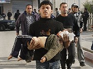 | Palestinian medics carry a child injured in Israeli shelling into Kamal Adwan Hospital in Beit Lahiya, northern Gaza Strip, Sunday, 04 Jan. 2009 |
