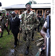 | Rebel General Laurent Nkunda (C) walks in the courtyard of a house after speaking with the press in the town of Kitshoumba, 02 Nov 2008 |