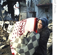 | A Palestinian woman carries her belongings5 in Rafah, after Israeli air strikes, 12 Jan 2009 |