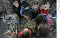 | Palestinians who fled their homes eat at a United Nations school where they are sheltering in the Jebaliya refugee camp, northern Gaza Strip, Monday, 12 Jan. 2009 |