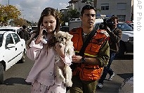 | An Israeli woman, suffering from shock, is helped by a soldier after a rocket fired from the Gaza Strip hit the southern town of Sderot, Sunday, 11 Jan. 2009 |