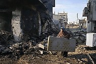 | A Palestinian woman carries a mattress5 from the rubble6 of a building in an area targeted by Israeli air strikes in Rafah, southern Gaza Strip, Monday, 12 Jan. 2009 |