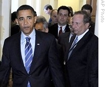 | President-elect Barack Obama, accompanied by National Economic Council Director-designate Lawrence Summers, leaves a Democratic policy luncheon4 on Capitol Hill, 13 Jan. 2009 |