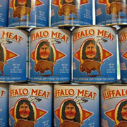 | Cans of bison meat on the shelves at the Three Rivers Café and co-op in Indiana. |