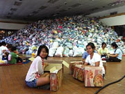 They then form a human chain passing the full bags onto massive piles which are later put on large trucks for distribution at evacuation shelters.