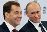 | Russian President Dmitry Medvedev, left, and Russian Prime Minister Vladimir Putin participate in a video conference with regional offices of the United Russia party, at the party's headquarters, Moscow, October 21, 2011. |