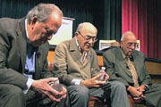 | Three longtime colleagues of Christian, Jewish and Muslim faiths, respectively - from left to right, Maher Hathout, Leonard Beerman and George Regas - recently shared their insights into religion with middle and high school students at Flintridge Preparatory School in Los Angeles, October 2011. |