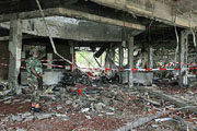 | A Nigerian soldier secures the area at the United Nation's office following a suicide car bomb attack in Abuja, Nigeria, Aug. 27, 2011. (file photo) |