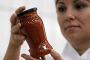 | A worker inspects a jar of pasta sauce in one of Paolo Ricciulli's factories - which employs around 220 people at his Althea-Delfino group, Italy's biggest manufacturer of ready-made pasta sauce, with revenues of 62 million euros and two plants in Parma and Acerra, near Naples in Parma, November 11, 2011. |