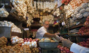 | A vendor8 exchanges money with a customer at a shop selling garlic, onions and potatoes at a wholesale9 market in Mumbai, April 28, 2011. |