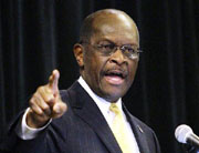 | Republican presidential candidate, Herman Cain makes a point during a speech at a campaign rally, in Dayton, Ohio, November 30, 2011. |