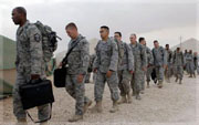 | U.S. servicemen line up to board a bus as they begin their journey home at al-Asad Air Base west of Baghdad, Iraq, Tuesday, Nov. 1 , 2011. |