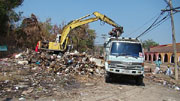 The backhoe lifts piles of discarded rubbish left from flood-stricken homes and businesses in the Muang Ake community on the outskirts3 of Bangkok.