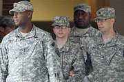 | Army Private First Class Bradley Manning (C) is escorted out of a courthouse in Fort Meade, Maryland, December 21, 2011. |