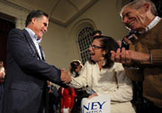 | Republican presidential candidate and former Massachusetts Governor Mitt8 Romney greets audience members at a campaign stop in Peterborough, New Hampshire January 4, 2012, one day after winning the Iowa caucus2. |
